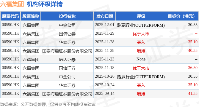 海通国际发表报告,首予六福集团(00590.HK)“跑赢大市”评级。预测2026至2028财年净利润分别为 15.78亿、18亿及19.77亿元,参考可比公司估值,给予2026财年市盈率15倍,目标价40.35元。