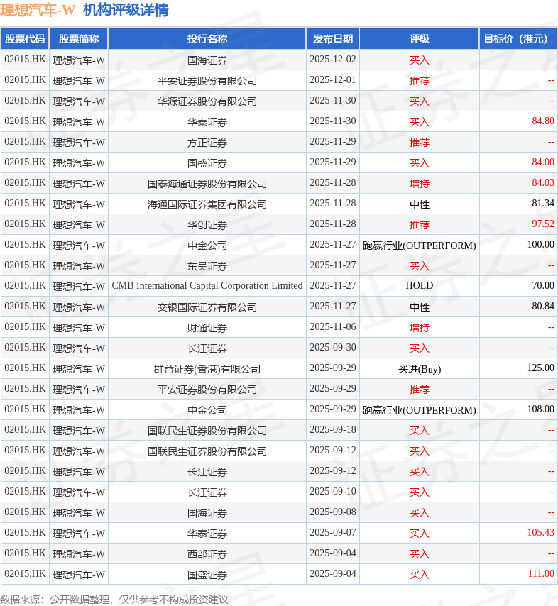 投行对该股的评级以买入为主,近90天内共有14家投行给出买入评级,近90天的目标均价为94.33港元。国海证券最新一份研报给予理想汽车-W买入评级。
