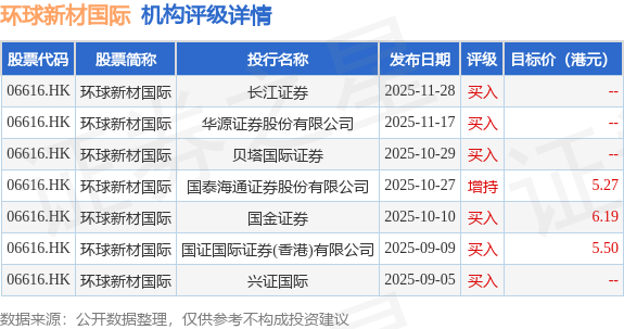 投行对该股的评级以买入为主,近90天内共有6家投行给出买入评级,近90天的目标均价为5.65港元。长江证券最新一份研报给予环球新材国际买入评级。