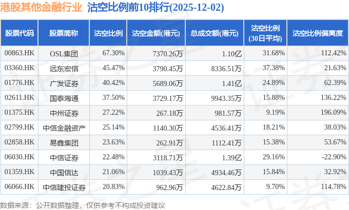 从沽空比例来看,OSL集团、远东宏信、广发证券沽空比例位居行业前三,分别为67.3%、45.47%、40.42%。