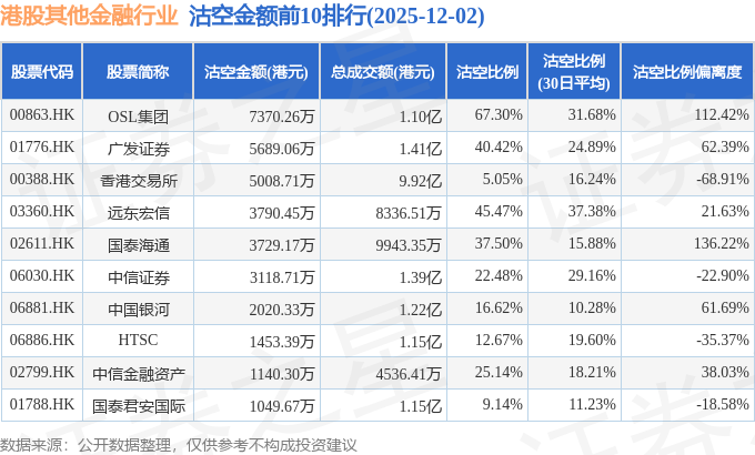 从沽空金额来看,OSL集团、广发证券、香港交易所沽空金额位居行业前三,分别为7370.26万港元、5689.06万港元、5008.71万港元。