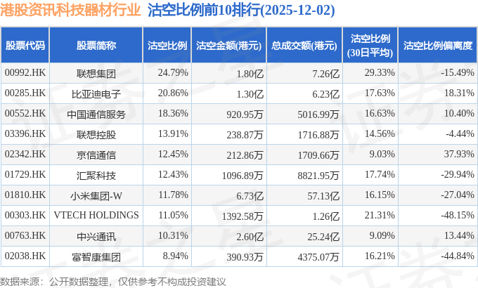 从沽空比例来看,联想集团、比亚迪电子、中国通信服务沽空比例位居行业前三,分别为24.79%、20.86%、18.36%。