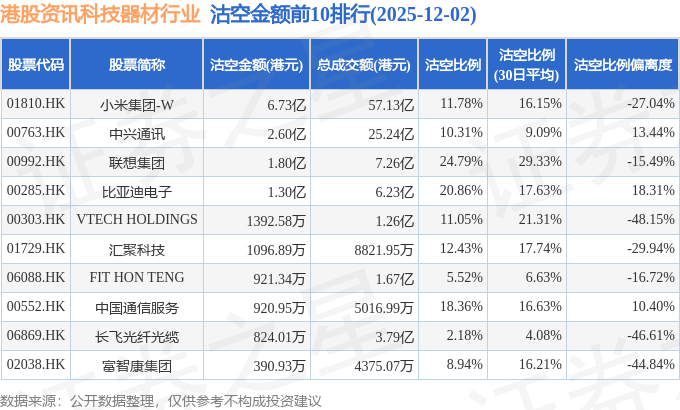 从沽空金额来看,小米集团-W、中兴通讯、联想集团沽空金额位居行业前三,分别为6.73亿港元、2.6亿港元、1.8亿港元。