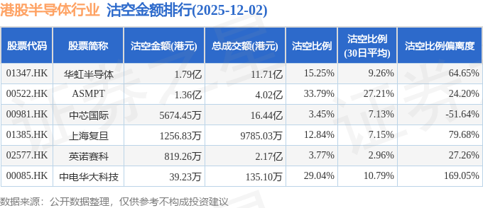 从沽空比例来看,ASMPT、中电华大科技、华虹半导体沽空比例位居行业前三,分别为33.79%、29.04%、15.25%。