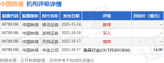 截至2025年12月2日收盘,中国铁塔(00788.HK)报收于12.78港元,上涨2.08%,成交量2803.09万股,成交额3.57亿港元。投行对该股的评级以跑赢行业(OUTPERFORM)为主,近90天内共有1家投行给出跑赢行业(OUTPERFORM)评级,近90天的目标均价为14港元。银河证券最新一份研报给予中国铁塔推荐评级。