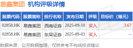 截至2025年12月2日收盘,易鑫集团(02858.HK)报收于2.42港元,上涨0.83%,成交量461.53万股,成交额1112.41万港元。投行对该股的评级以买入为主,近90天内共有2家投行给出买入评级,近90天的目标均价为3.67港元。西南证券最新一份研报给予易鑫集团买入评级,目标价3.67港元。