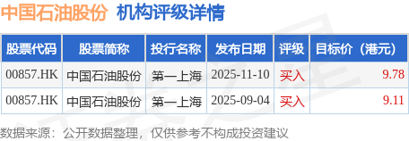 截至2025年12月2日收盘,中国石油股份(00857.HK)报收于8.85港元,上涨0.8%,成交量6011.95万股,成交额5.34亿港元。投行对该股的评级以买入为主,近90天内共有2家投行给出买入评级,近90天的目标均价为9.44港元。第一上海最新一份研报给予中国石油股份买入评级,目标价9.78港元。