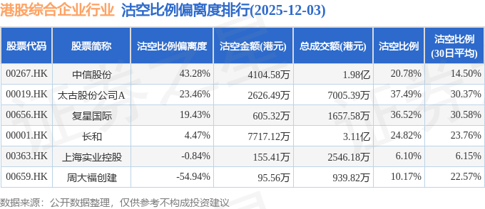 从沽空比例偏离度来看,中信股份、太古股份公司A、复星国际沽空比例偏离度位居行业前三,分别为43.28%、23.46%、19.43%。