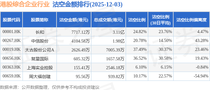 从沽空金额来看,长和、中信股份、太古股份公司A沽空金额位居行业前三,分别为7717.12万港元、4104.58万港元、2626.49万港元。