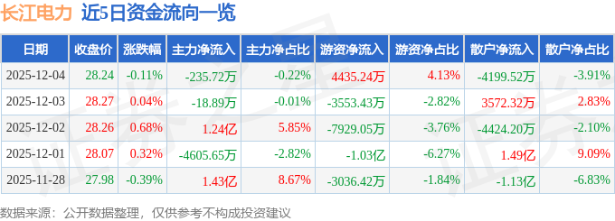 证券之星消息,截至2025年12月4日收盘,长江电力(600900)报收于28.24元,下跌0.11%,换手率0.16%,成交量38.0万手,成交额10.73亿元。