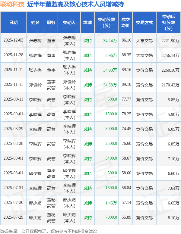 联动科技近半年内的董监高及核心技术人员增减持详情如下:
