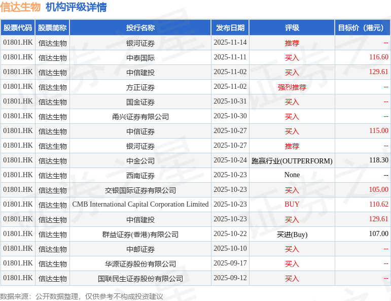 投行对该股的评级以买入为主,近90天内共有10家投行给出买入评级,近90天的目标均价为116.47港元。银河证券最新一份研报给予信达生物推荐评级。