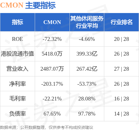CMON港股市值5418万港元,在其他休闲服务行业中排名第26。主要指标见下表: