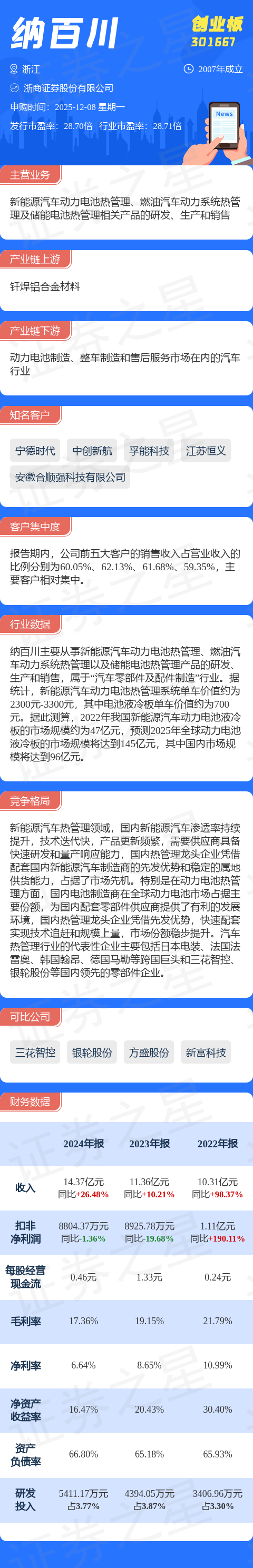 证券之星消息,纳百川12月8日网上申购,申购代码为301667,中签号公布日期为12月10日。该股概况请见下图: