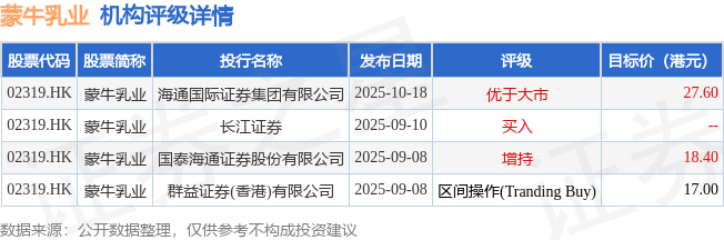 截至2025年12月5日收盘,蒙牛乳业(02319.HK)报收于14.66港元,下跌0.74%,成交量1785.19万股,成交额2.61亿港元。投行对该股的评级以增持为主,近90天内共有1家投行给出增持评级,近90天的目标均价为21港元。海通国际证券集团有限公司最新一份研报给予蒙牛乳业优于大市评级,目标价27.6港元。