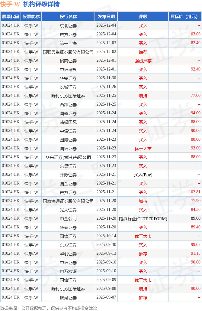 截至2025年12月5日收盘,快手-W(01024.HK)报收于69.2港元,上涨2.52%,成交量2905.83万股,成交额19.87亿港元。投行对该股的评级以买入为主,近90天内共有20家投行给出买入评级,近90天的目标均价为89.97港元。东北证券最新一份研报给予快手-W买入评级。