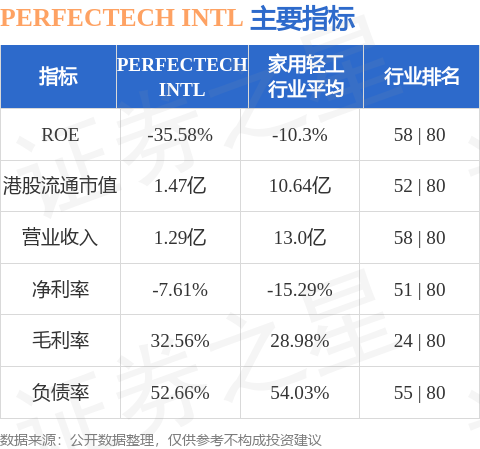 PERFECTECH INTL港股市值1.47亿港元,在家用轻工行业中排名第52。主要指标见下表: