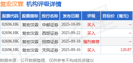 投行对该股的评级以买入为主,近90天内共有3家投行给出买入评级,近90天的目标均价为120.87港元。中邮证券最新一份研报给予复宏汉霖买入评级。
