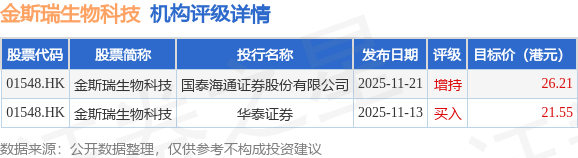 投行对该股的评级以增持为主,近90天内共有1家投行给出增持评级,近90天的目标均价为23.88港元。国泰海通证券股份有限公司最新一份研报给予金斯瑞生物科技增持评级,目标价26.21港元。
