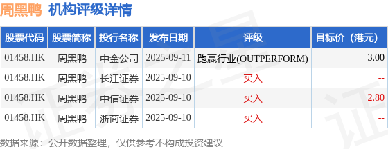 投行对该股的评级以买入为主,近90天内共有3家投行给出买入评级,近90天的目标均价为2.9港元。中金公司最新一份研报给予周黑鸭跑赢行业(OUTPERFORM)评级,目标价3港元。