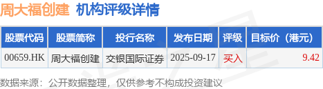 投行对该股的评级以买入为主,近90天内共有1家投行给出买入评级,近90天的目标均价为9.42港元。交银国际证券最新一份研报给予周大福创建买入评级,目标价9.42港元。