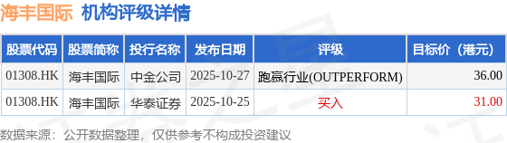 投行对该股的评级以跑赢行业(OUTPERFORM)为主,近90天内共有1家投行给出跑赢行业(OUTPERFORM)评级,近90天的目标均价为33.5港元。中金公司最新一份研报给予海丰国际跑赢行业(OUTPERFORM)评级,目标价36港元。