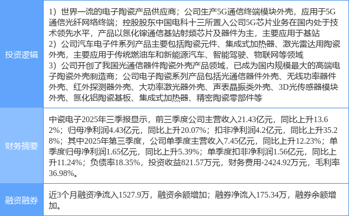 证券之星消息,中瓷电子12月8日涨停收盘,收盘价59.37元。该股于9点25分涨停,未打开涨停,截止收盘封单资金为1.96亿元,占其流通市值0.97%。