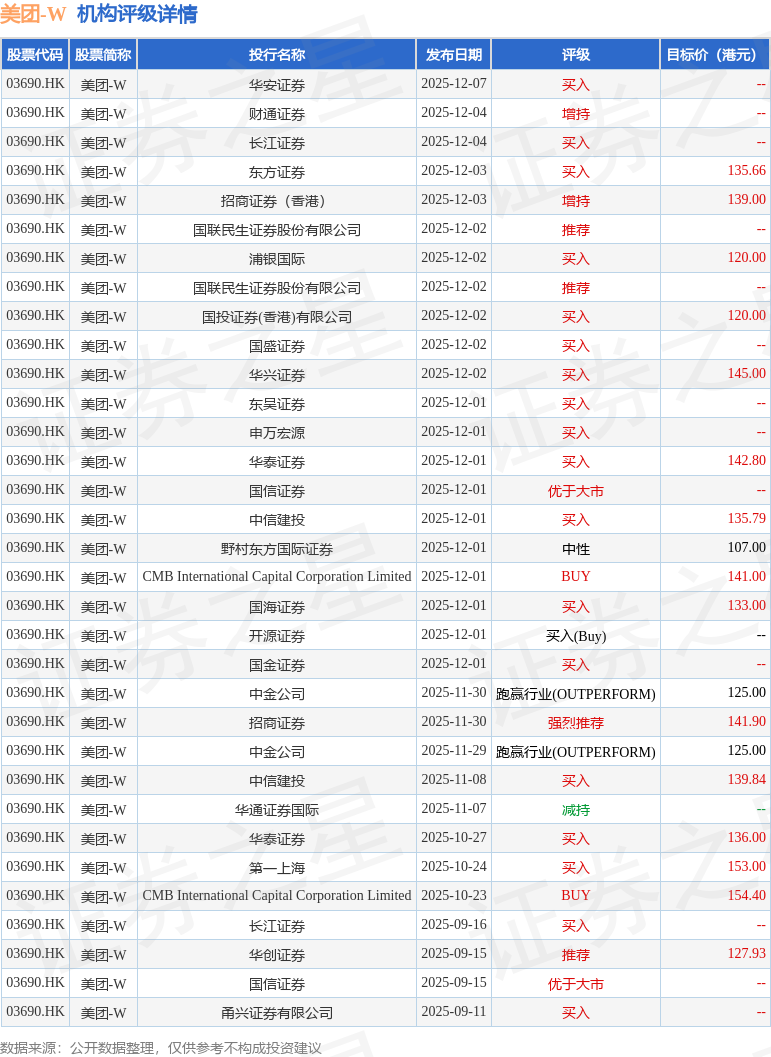 截至2025年12月8日收盘,美团-W(03690.HK)报收于99.5港元,上涨0.45%,成交量3114.55万股,成交额31.02亿港元。投行对该股的评级以买入为主,近90天内共有18家投行给出买入评级,近90天的目标均价为134.57港元。华安证券最新一份研报给予美团-W买入评级。