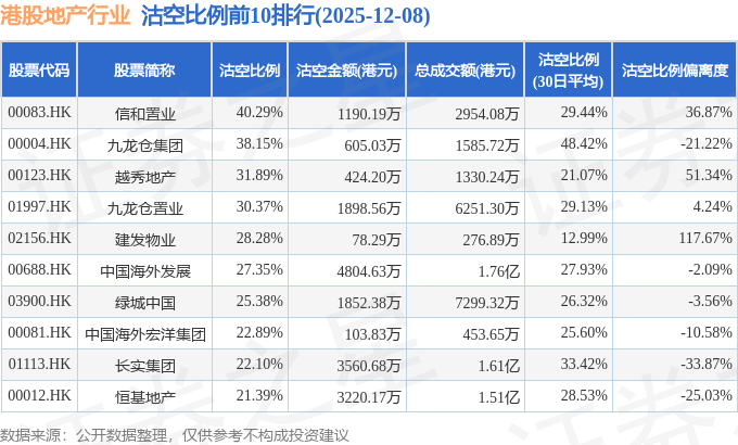 从沽空比例来看,信和置业、九龙仓集团、越秀地产沽空比例位居行业前三,分别为40.29%、38.15%、31.89%。