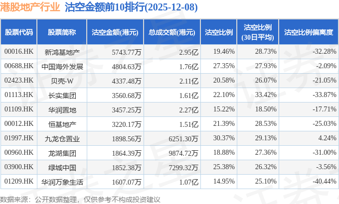 从沽空金额来看,新鸿基地产、中国海外发展、贝壳-W沽空金额位居行业前三,分别为5743.77万港元、4804.63万港元、4337.48万港元。