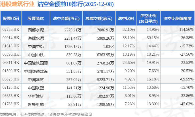 从沽空金额来看,西部水泥、海螺水泥、中国中冶沽空金额位居行业前三,分别为2275.21万港元、2251.44万港元、1256.18万港元。