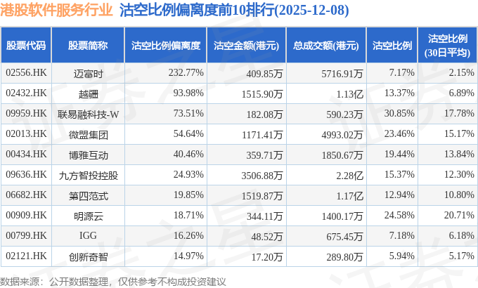 从沽空比例偏离度来看,迈富时、越疆、联易融科技-W沽空比例偏离度位居行业前三,分别为232.77%、93.98%、73.51%。