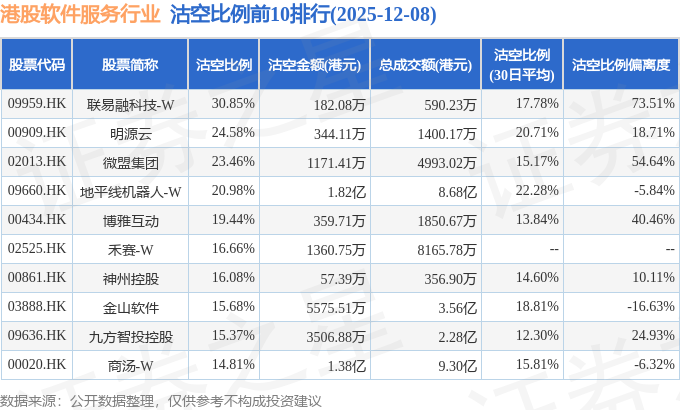 从沽空比例来看,联易融科技-W、明源云、微盟集团沽空比例位居行业前三,分别为30.85%、24.58%、23.46%。