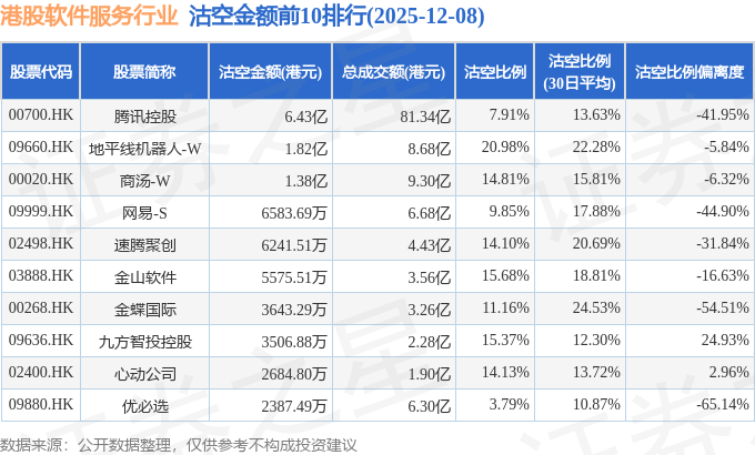 从沽空金额来看,腾讯控股、地平线机器人-W、商汤-W沽空金额位居行业前三,分别为6.43亿港元、1.82亿港元、1.38亿港元。