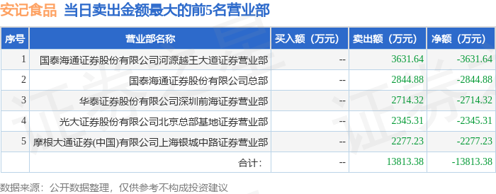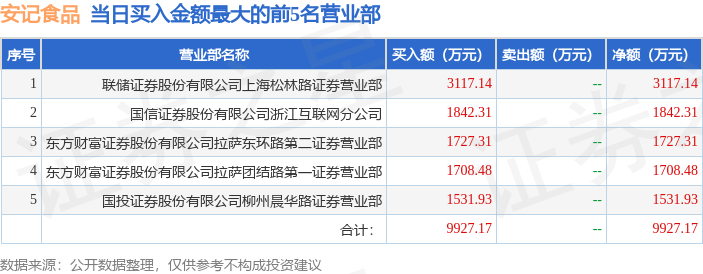证券之星消息,沪深交易所2025年12月10日公布的交易公开信息显示,安记食品(603696)因有价格涨跌幅限制的日换手率达到20%的前五只证券登上龙虎榜。此次是近5个交易日内第3次上榜。