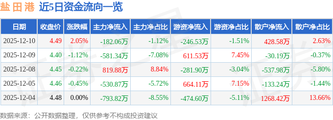 证券之星消息,截至2025年12月10日收盘,盐 田 港(000088)报收于4.49元,上涨2.05%,换手率1.16%,成交量36.56万手,成交额1.63亿元。