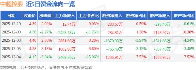 证券之星消息,截至2025年12月10日收盘,中超控股(002471)报收于4.39元,上涨2.09%,换手率8.1%,成交量108.35万手,成交额4.82亿元。