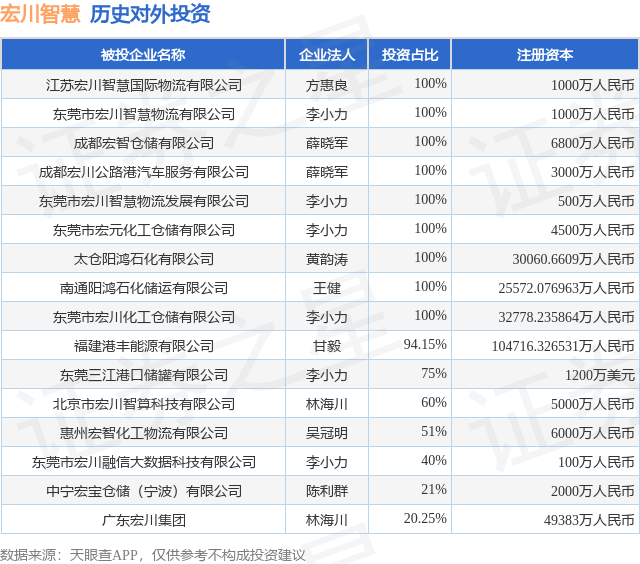 通过天眼查大数据分析,广东宏川智慧物流股份有限公司共对外投资了15家企业;财产线索方面有商标信息8条,著作权信息4条;此外企业还拥有行政许可8个。据2024年报数据,宏川智慧商誉8.18亿元,同比减2.94%。长期股权投资7.32亿元,同比减1.05%。