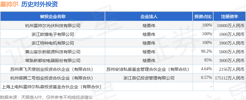 证券之星消息,根据天眼查APP显示,星帅尔(002860.SZ)新增一起对外投资事件,被投资公司为杭州容腾二号创业投资合伙企业(有限合伙),法定代表人浙江容亿投资管理有限公司,投资占比为0.57%。该公司从事商务服务业,注册资本为175112万人民币。目前,星帅尔共存在对外投资8项,详见下表: