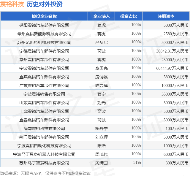 证券之星消息,根据天眼查APP显示,震裕科技(300953.SZ)新增一起对外投资事件,被投资公司为枞阳震裕汽车部件有限公司,法定代表人蒋虎,投资占比为100%。该公司从事汽车制造业,注册资本为5000万人民币。目前,震裕科技共存在对外投资17项,详见下表: