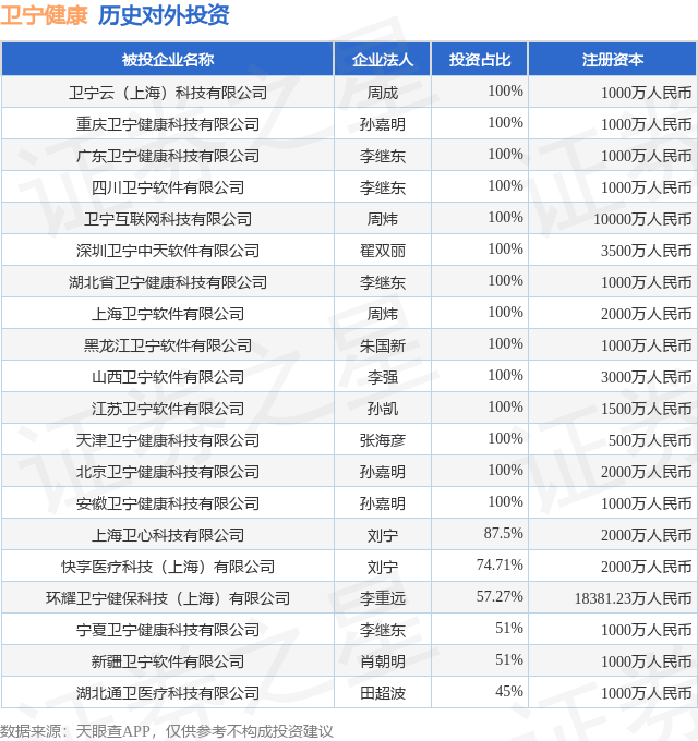 证券之星消息,根据天眼查APP显示,卫宁健康(300253.SZ)新增一起对外投资事件,被投资公司为卫宁云(上海)科技有限公司,法定代表人周成,投资占比为100%。该公司从事软件和信息技术服务业,注册资本为1000万人民币。目前,卫宁健康共存在对外投资39项,投资占比前20的项目见下表: