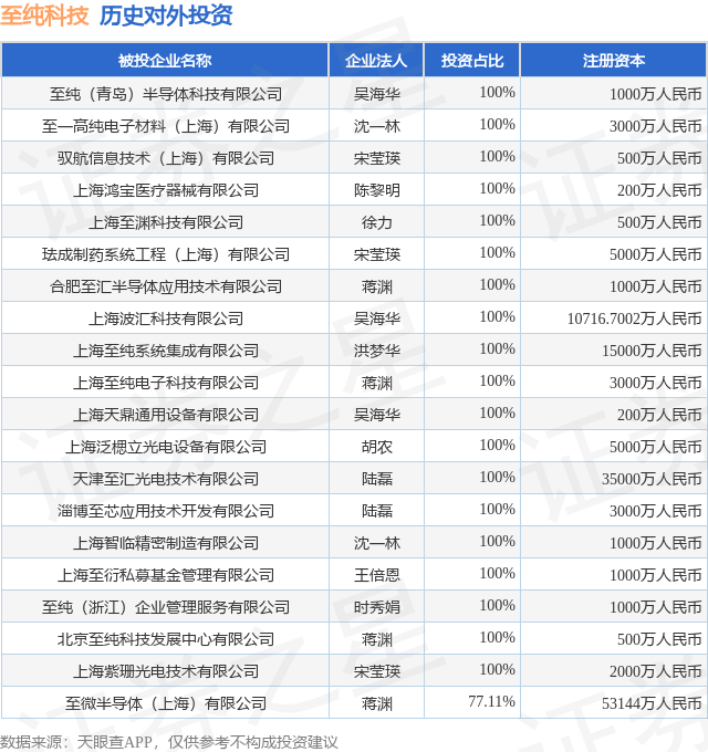 证券之星消息,根据天眼查APP显示,至纯科技(603690.SH)新增一起对外投资事件,被投资公司为至纯(青岛)半导体科技有限公司,法定代表人吴海华,投资占比为100%。该公司从事专业技术服务业,注册资本为1000万人民币。目前,至纯科技共存在对外投资43项,投资占比前20的项目见下表: