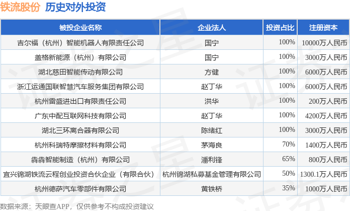 证券之星消息,根据天眼查APP显示,铁流股份(603926.SH)新增一起对外投资事件,被投资公司为吉尔福(杭州)智能机器人有限责任公司,法定代表人国宁,投资占比为100%。该公司从事计算机、通信和其他电子设备制造业,注册资本为10000万人民币。目前,铁流股份共存在对外投资11项,详见下表:
