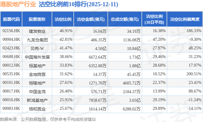 从沽空比例来看,建发物业、九龙仓集团、贝壳-W沽空比例位居行业前三,分别为46.91%、42.81%、41.47%。