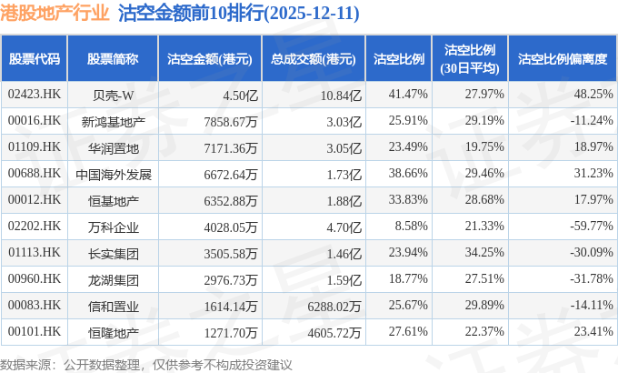 从沽空金额来看,贝壳-W、新鸿基地产、华润置地沽空金额位居行业前三,分别为4.5亿港元、7858.67万港元、7171.36万港元。