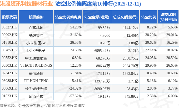从沽空比例偏离度来看,百富环球、联想集团、小米集团-W沽空比例偏离度位居行业前三,分别为54.28%、31.69%、26.56%。