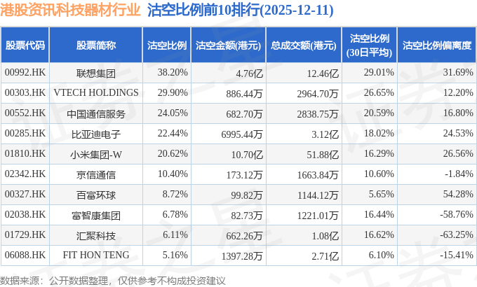从沽空比例来看,联想集团、VTECH HOLDINGS、中国通信服务沽空比例位居行业前三,分别为38.2%、29.9%、24.05%。