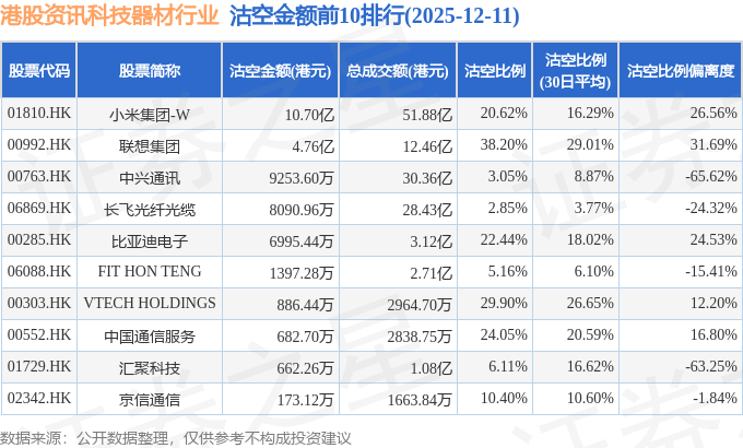 从沽空金额来看,小米集团-W、联想集团、中兴通讯沽空金额位居行业前三,分别为10.7亿港元、4.76亿港元、9253.6万港元。