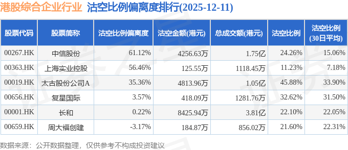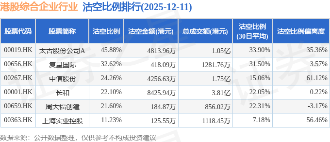 从沽空比例来看,太古股份公司A、复星国际、中信股份沽空比例位居行业前三,分别为45.88%、32.62%、24.26%。