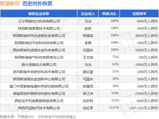 证券之星消息,根据天眼查APP显示,斯瑞新材(688102.SH)新增一起对外投资事件,被投资公司为辽宁西瑞动力科技有限公司,法定代表人马治,投资占比为100%。该公司从事通用设备制造业,注册资本为8000万人民币。目前,斯瑞新材共存在对外投资13项,详见下表: